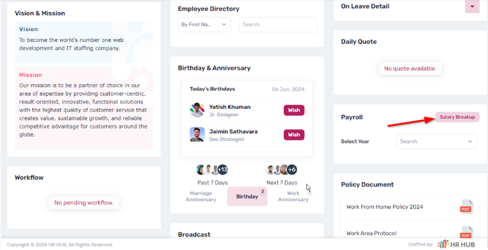 On the main HR HUB dashboard, you can easily view the salary slip structure by clicking on the “Salary Breakup” button.