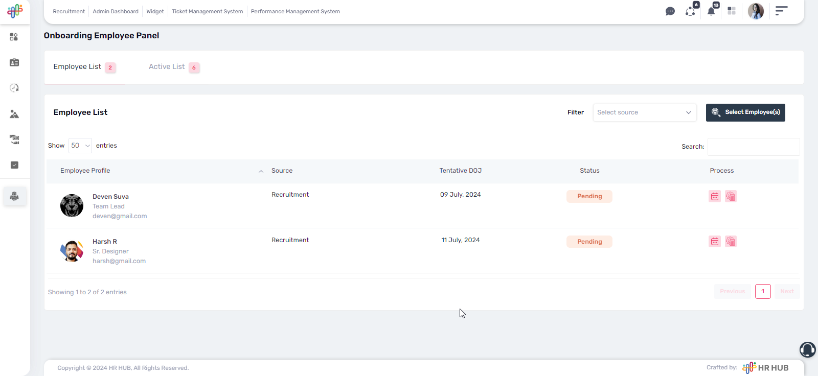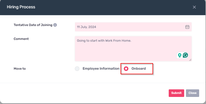 Navigate to the “Recruitment ⇒ Administrator ⇒ Candidate Listing.” You need to update the status of the specific employee to the hiring stage. Once done, you’ll see the option to move the application to the onboarding process as shown below: